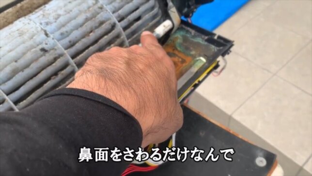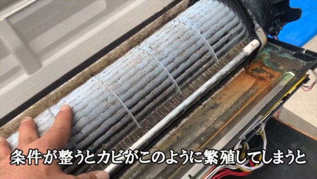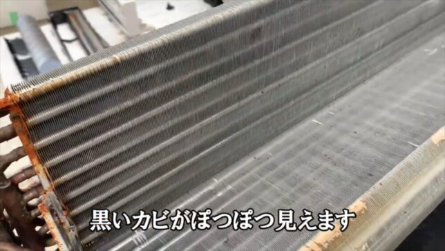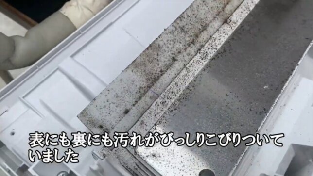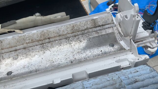 このエアコンは去年と今年で他社で通常のクリーニングをされて、その直後から黒いカビがポツポツと落ちてきたとのことです
