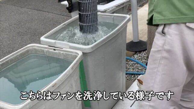 エアコンの部品を洗剤入りバケツにつけ置きしてから洗浄していき、洗浄が終わったら水だけが入ったバケツに残った洗剤を落としていきます!