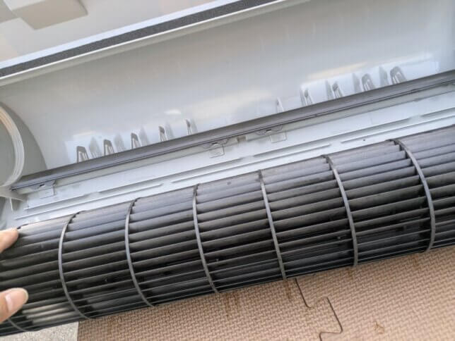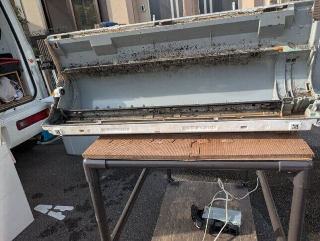 しかし、壁に掛けたままの洗浄では、逆にカビを奥へ押し込んでしまったり、ファンの回転で熱交換器の裏側に汚れを飛び散らせてしまったりすることが多々あります。