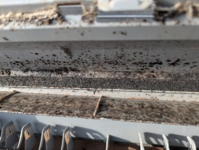手が届く範囲だけはピカピカですが、ドレンパン、ケーシングの裏、ファンの奥、熱交換器の内側……。