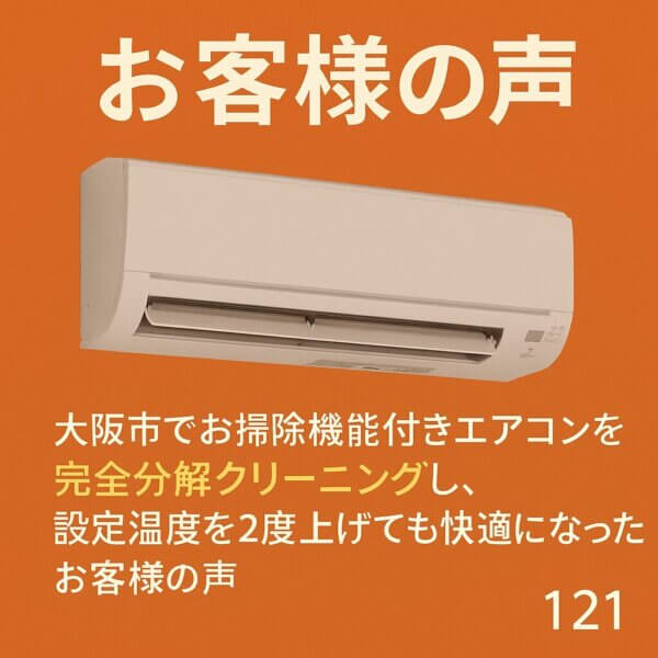 大阪市でお掃除機能付きエアコンを完全分解クリーニングし、設定温度を2度上げても快適になったお客様の声(No.121)
